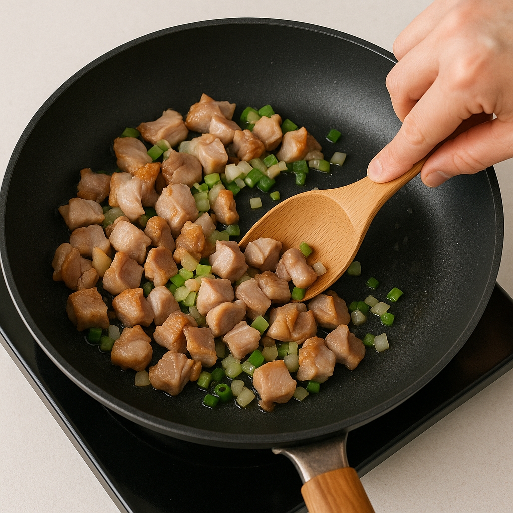 - 볶기: 중불로 달군 팬에 기름을 살짝 두르고 파와 양파를 볶아 향을 냅니다.